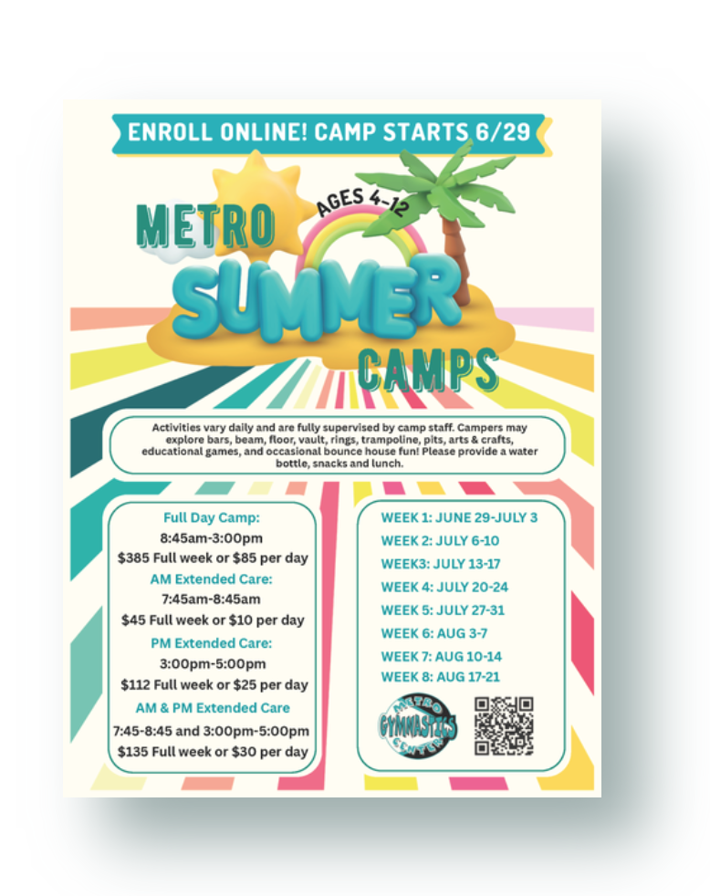 Join us for 8 exciting weeks of action-packed fun! Flexible options include morning, afternoon, or full-day extended care so you can pick what works best for you. Campers will enjoy a variety of daily activities like bars, beam, floor, vault, rings, trampoline, foam pit, arts & crafts, educational games, and even bounce house days.